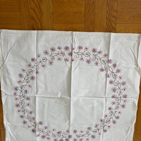 Handbroderad duk med broderi på vit textil. Duken är kvadratisk och har broderade blommönster i flera färger samt virkad spetskant runt om. Passar som bordsduk eller större duk på matbord eller soffbord. Materialet är ett vävt tyg, troligen bomull eller bomullsblandning, med korsstygnsbroderi i mitten och längs kanterna.