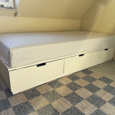 IKEA säng med förvaringslådor i vit färg. Sängen har utdragbara lådor under liggytan som ger extra förvaringsutrymme för till exempel sängkläder, kläder eller andra textilier. Passar som enkelsäng i sovrum eller gästrum. Utförande i vitlackerad träbas/laminat med integrerade handtag på lådorna för enkel öppning och stängning.