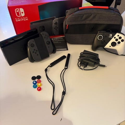 Nintendo Switch spelkonsol med neonröda och neonblå Joy-Con-handkontroller. Konsolen kan användas både som bärbar enhet och ansluten till TV via dockningsstation. Joy-Con-handkontrollerna kan fästas på konsolen för handhållet läge eller användas trådlöst. Lämplig för spel både hemma och på resande fot.