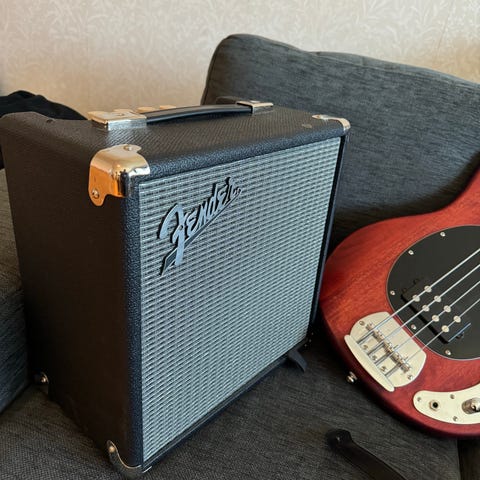 Fender högtalare och kabinett för förstärkare. Större modell, avsett för elgitarr eller elbas. Framsidan har klassiskt tygskydd och Fender-logotyp i hörnet. Med hjul.