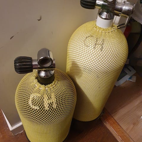Ena delen sätts på canister / ponny cylindern, medan den andra delen är fäst vid tex den vanliga dykflaska i tankbandet på BCDn eller ett löst tankband.