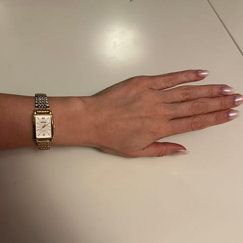 Denna produkt är en guldfärgad armbandsur för damer med ett svart läderarmband, som liknar modeller från märken som Segal eller liknande prisvärda tillverkare. nu batteri behöver