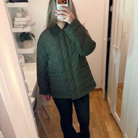 Jätte fint jacka för dam i storlek M. Jackan är röd och tillverkad i läder. Modellen har längre passform med resår nedtill bak, knappstängning framtill och flera sömdetaljer. Passar som ytterplagg under svalare dagar.
