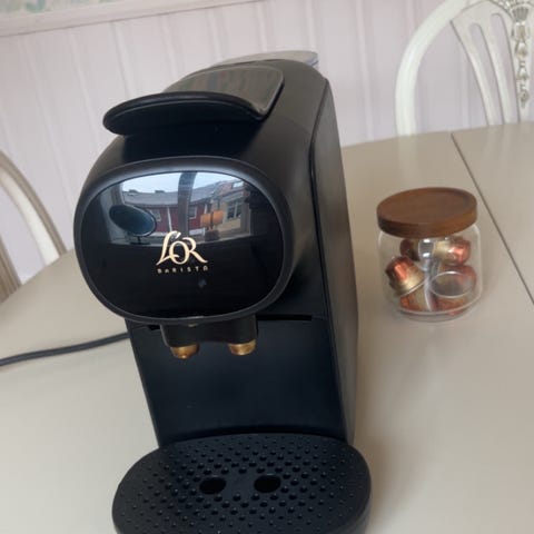 Philips L’OR kapselmaskin i svart utförande. Maskinen är avsedd för kaffekapslar av L’OR-typ och har en kompakt design som passar på mindre bänkyta. På ovansidan finns flera knappar för val av olika koppstorlekar. Vattentanken sitter på baksidan och är avtagbar för påfyllning och rengöring. Droppbrickan framtill samlar upp spill och kan tas loss vid rengöring. Maskinen är lämplig för bryggning av enstaka koppar kaffe eller espresso med kapselsystem.