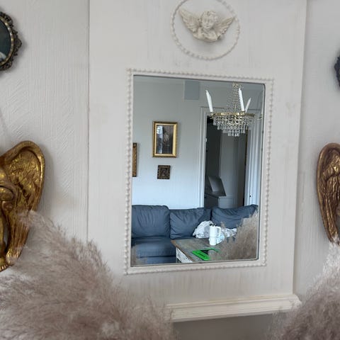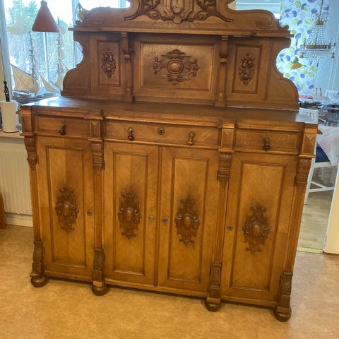 Sideboard i massivt trä med spegel och överhylla. Möbeln har två lådor upptill samt två skåpsdörrar nedtill med dekorativa paneler. Ovandelen har en upphöjd hylla med svarvade pelare och spegel bakom. Passar som förvaringsmöbel i exempelvis vardagsrum, matsal eller hall.