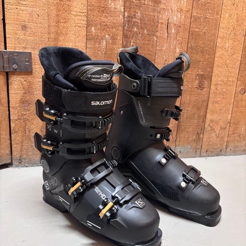 Salomon X-Max 90W. En dam pjäxa i storlek 25,5. Fint skick men finns lite skav på vissa spännen.