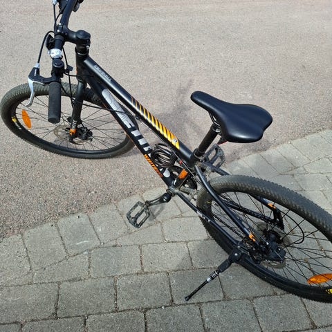 Scott mountainbike med ramstorlek L och 26" hjul. Cykeln har aluminiumram (alloy) och är utrustad med grovmönstrade däck anpassade för terrängkörning. Modellen har flera växlar med bakre växelpaket och kedjedrev fram, fälgbromsar samt reflexer på hjulen. Sadeln är justerbar i höjd, dämpare fram och cykeln är försedd med stänkskärm bak
