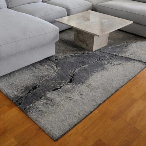 Säljer matta i rektangulär form med patchwork-liknande mönster i svart, mörkgrå och ljusgrå nyanser.