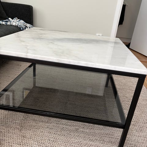 Säljer ett fyrkantigt soffbord 75 × 75 cm med vit marmormönstrad glasskiva och svart metallram med dubbel fot. Stabil konstruktion, stilren design och lätt att hålla rent.