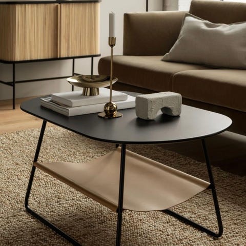 Ovalt soffbord från H&M Home med svart träskiva, svart järnunderrede och en hylla i cognacfärgat läder undertill (för tidningar, fjärrkontroller osv).