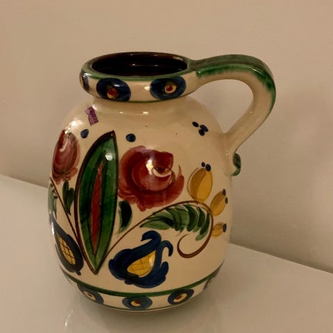 En fin keramik kanna med handmålat blommönster i rosa, blått och grönt . Den har en gul kant upptill och nedtill. Höjd 20 cm och diameter 12 cm. Kannan har ett handtag och en rundad form, lämplig för servering av drycker eller blomvas.