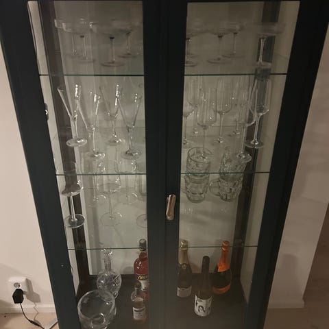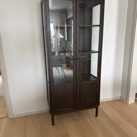 Säljer svart vitrinskåp från Jysk. Hyllplan och ram i metall, dörrar med glas. Skicket är ingenting att anmärka på. Hittills har skåpet bott i djur- och rökfritt hem, men den är öppen för förslag.
