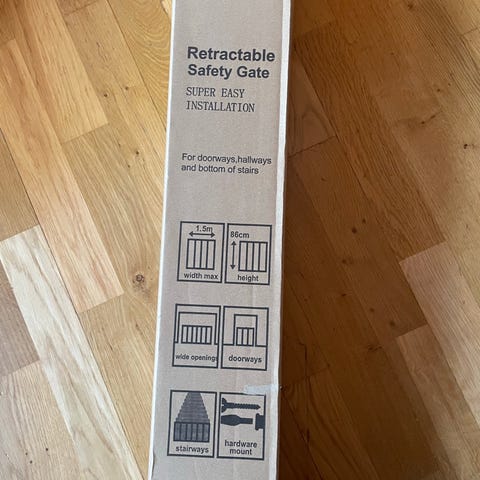 säkerhetsgrind i vit metall. Grind avsedd för montering vid trappa eller dörröppning för att begränsa barns åtkomst till vissa utrymmen. Består av huvudgrind med öppningsbar sektion samt sidodelar/förlängningar för anpassning mot vägg eller räcke. Passar inomhusbruk och kan användas i hem med små barn där man behöver en fysisk avgränsning vid exempelvis trappor eller passager.