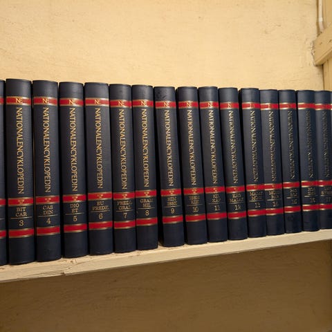 Nationalencyklopedin i halvfranskt band med guldsnitt.