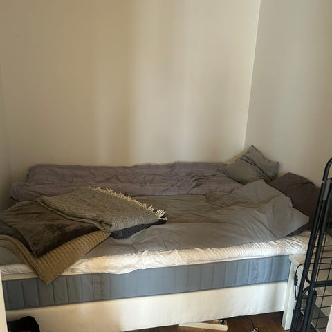 IKEA säng med resårbotten i grått tyg. Sängen står på ben i trä som ger en stabil konstruktion och en behaglig höjd från golvet. Överkast och kuddar på bilden ingår inte, utan annonsen avser säng och resårbotten. Däremot kan sängkappan ingå om så önskas. Bäddmadrass medföljer ej. Passar som enkel- eller mindre dubbelsäng beroende på.
