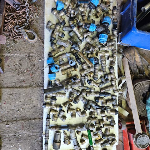 Blandade rörkopplingar och beslag i metall. Innehåller olika typer av kopplingar, muttrar och nipplar sorterade i fack. Lämpliga för VVS- och rörarbeten där olika dimensioner och utföranden kan behövas. Exakta storlekar och gängor framgår inte av bilden och kan behöva kontrolleras vid hämtning eller genomgång av innehållet.