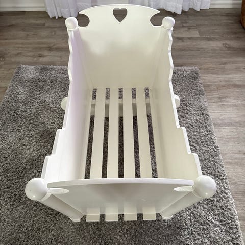 Fin gammaldags vagga i trä som är ommålad i vit färg.