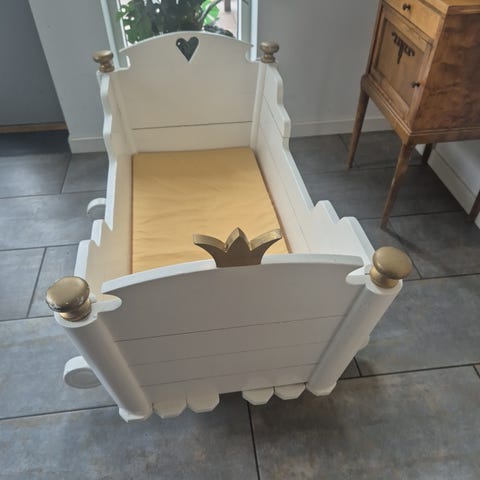 Fin gammaldags vagga i trä som är ommålad i vit färg. Madrass finns om man vill ha den.