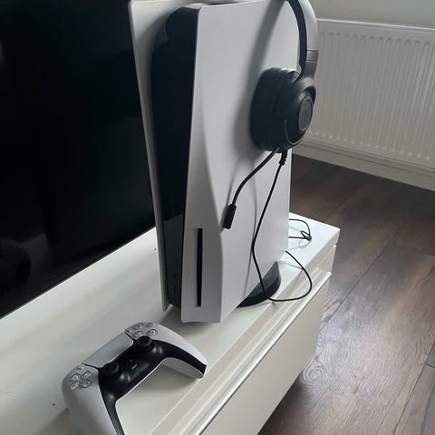 Sony Playstation 5 spelkonsol i vit färg med skivläsare. I paketet ingår en handkontroll, strömkabel, HDMI-kabel och laddare.