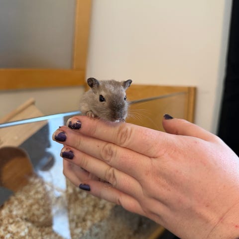 Vi kallar honom peanut. Modig liten kille som gärna kommer upp i handen för att utforska hela handen, armen och insidan av tröjan. Har alltid varit störst i kullen och är väldigt matglad. Favoritsysslan är gräva gräva gräva.