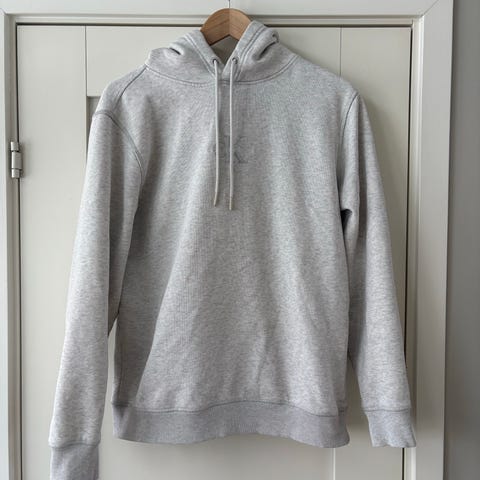 Gant huvtröja för herr i storlek M. Tröjan är grå och tillverkad i bomull. Klassisk modell med huva och dragsko samt magficka framtill.
