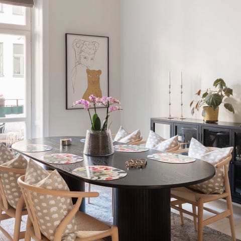 Ovalt matbord i ekfärgad konstfanér. Bordet har 2 klaffar med gångjärn så att det kan fällas ihop helt eller delvis. B80 x L38/100/163 x H76 cm