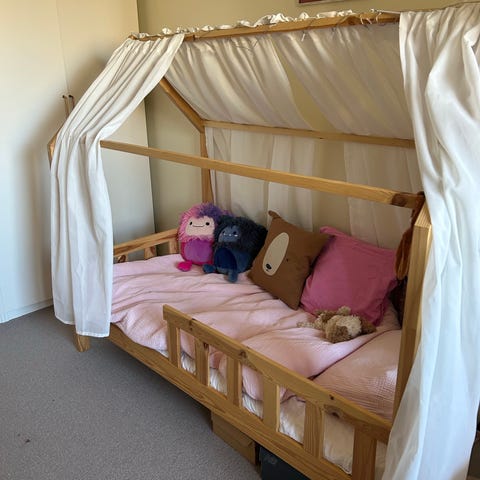 CASTILLO är en rustik barnsäng av massiv, FSC-märkt furu. Träfärgad är obehandlad, övriga är målade. Sängen är som ett litet hus, mysig att sova i på natten och att leka i på dagen. Vårt barn har älskat den jättemycket. Komplettera med en madrass storlek 90x200 cm.