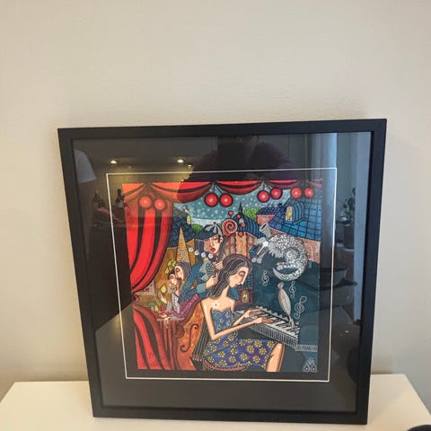 Unik Fotokonst tavla av Björn Abelin med motivet från en föreställning på Kungliga Operan men Kungliga Baletten. Färgfotografi monterat på skiva med träram på baksidan. Motivet visar en scen med flera personer i scenkläder i starka färger. Passar som väggdekoration i vardagsrum, hall eller arbetsrum.