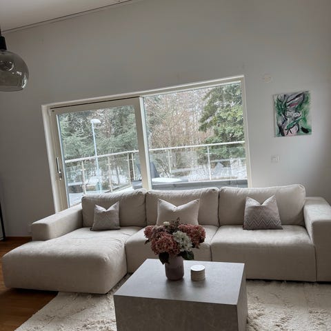 Det finns vissa bruksspår och ena ryggstödet är något snett. Soffan är uppdelad i flera moduler/fåtöljer, så det går att byta ut en del och köpa ny i butik vid behov.