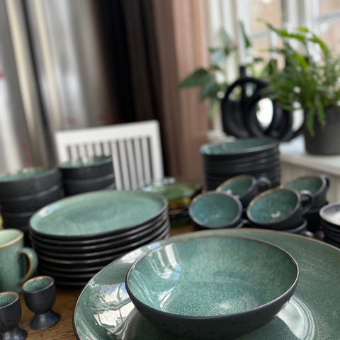 (Finns 3 till 27cm tallrikar med hack på kanten, samt en skål med tydliga skrapmärken, ej medräknade ovan) Övriga delar är i mycket bra skick med tanke på att de är 25 år gamla.