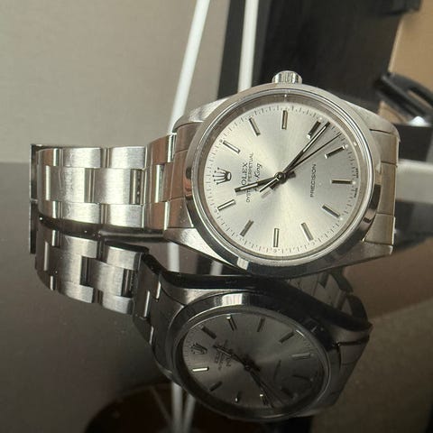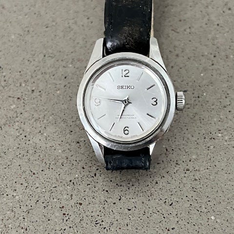 Schweizisk damklocka i rostfritt stål med manuellt mekaniskt urverk (kal. 13-20, 17 juveler). Kvadratiskt boett med rundade hörn, silverfärgad urtavla med baton-index och originalt integrerat stållänksband.