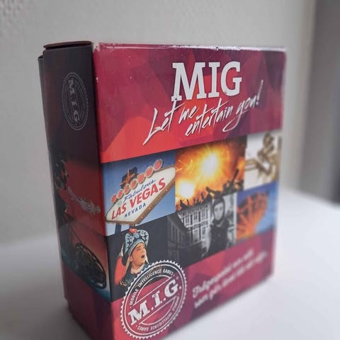 M.I.G. Familj frågespel. Portabelt kunskapsspel i kortleksformat med frågekort, tärningar och spelregler samlade i en kompakt ask. Spelet är utformat för att passa hela familjen och kan spelas hemma eller tas med på resa. Innehåller frågor inom olika ämnesområden anpassade för blandade åldrar.