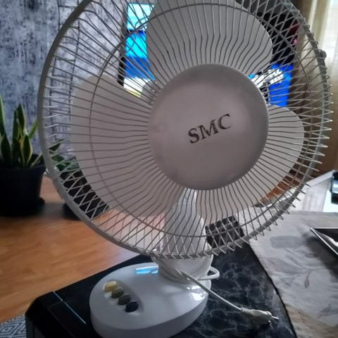 HQ bordfläkt i vit plast. Fläkten har tre blad och skyddsgaller runtom. På foten finns fyra knappar för olika hastighetslägen och avstängning. Fläkten är avsedd att stå på bord eller bänk och ansluts med nätsladd till vägguttag. Passar för användning i hem- eller kontorsmiljö för riktad luftcirkulation.