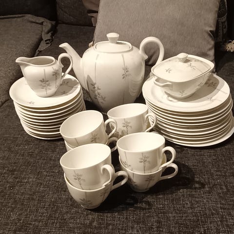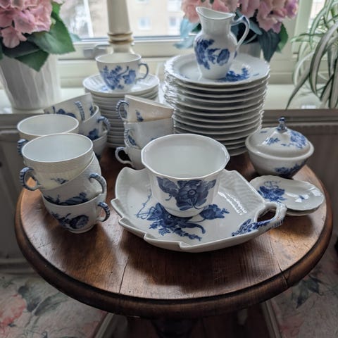 Blåvita kaffekoppar med tillhörande fat i porslin. Setet består av flera koppar och fat med klassiskt mönster i blått på vit botten. Passar för servering av kaffe, te eller andra varma drycker. Kopparna har öra och faten är runda med upphöjd kant. Mönstret är dekorativt och täcker både koppens utsida och fatets ovansida. 11 koppar o fat