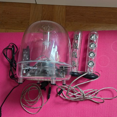 Harman Kardon högtalarset med subwoofer och 2 högtalare. I väl använt skick. Renoveringsobjekt. Högtalarna behöver rengöras från tejprester och limmas. Fungerar troligtvis.