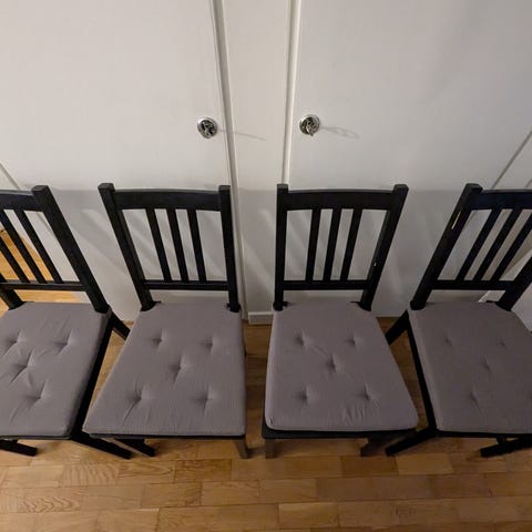4 stycken matbordsstolar från IKEA i serien omtänksam. Färgen har spruckit något på två av sitsarna, se bild.