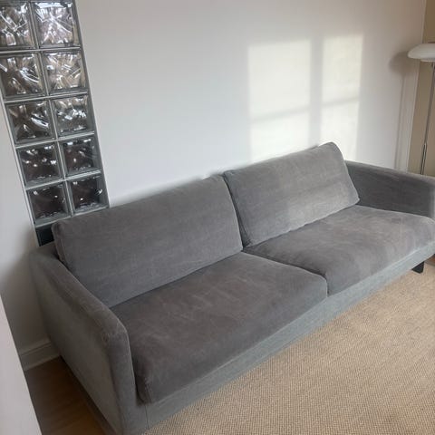 Stommen och soffans form är i fint skick. Klädseln är avtagbar och tvättbar. Det finns dock fläckar som vi ej har försökt få bort i tvätt, se bilder.