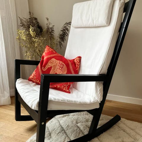 En skön stor fåtölj som har gungfunktion och uppfällbart fotstöd.