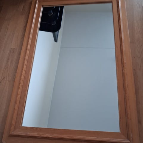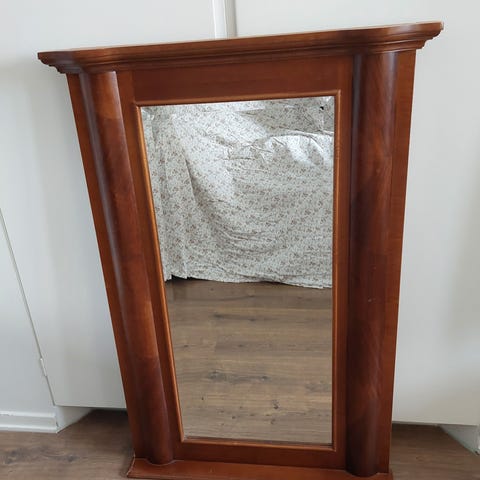 Rektangulär spegel med bred brun träram. Spegeln är avsedd för väggmontering och passar exempelvis i hall, sovrum eller vardagsrum. Träramen har dekorativa detaljer i hörnen och längs kanterna, vilket ger ett klassiskt uttryck. Storleken är anpassad för helkroppsspegling beroende på monteringens höjd. 120x70 cm