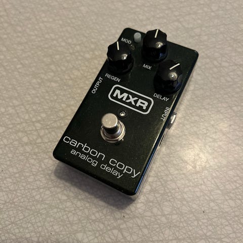 MXR Carbon Copy gitarrpedal analog delay i silverfärg. Pedalen har reglage för Mix, Regen och Delay samt en Mod-switch. Utrustad med fotomkopplare, in- och utgång för 6,3 mm telekontakt samt strömanslutning för nätadapter. Avsedd som effektpedal för elgitarr eller andra elektriska instrument som använder standard telekablar.
