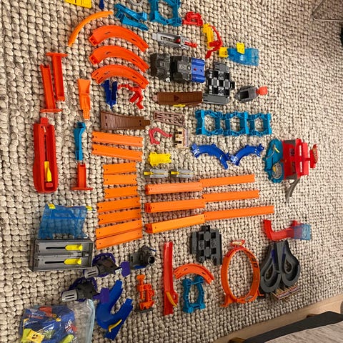 Hot Wheels bilbana i spiralform med flera nivåer. Banan är tillverkad i plast och har orange och gröna körslingor med blå stomme. Avsedd för små leksaksbilar från Hot Wheels eller liknande storlek. Passar för inomhuslek på golv eller matta och kan användas för att köra bilar i hög fart runt spiralen. Felfri kartong
