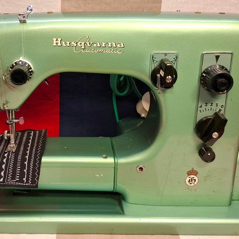 Husqvarna CL 21 symaskin i grön färg. Mekanisk modell med flera sömmar, vilket visas på provlappen på maskinens arbetsyta. Maskinen har friarm/planarbetsyta och reglering för stygnlängd och sömval på framsidan. Fotpedal och elkabel ingår, liksom en mindre tillbehörslåda. Passar för olika typer av sömnadsarbeten som lagning, uppläggning och enklare ny servad fungerar jättebra sömnadsprojekt i hemmet.