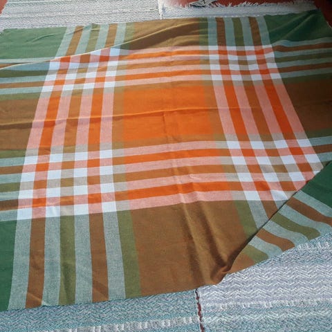 Vintage Duk med ett i ögonfallande vackert rutmönster. I färgerna orange, gul, brunt samt vit botten. Måttet mäter 77 cm på längden och 73cm på bredden. Perfekt för att ge ditt hem en retro touch. Materialet känns att vara av hög kvalitet, tror det kan vara kraftig bomull. Av sökningar på nätet så har jag inte fått fram ursprung eller designer.
