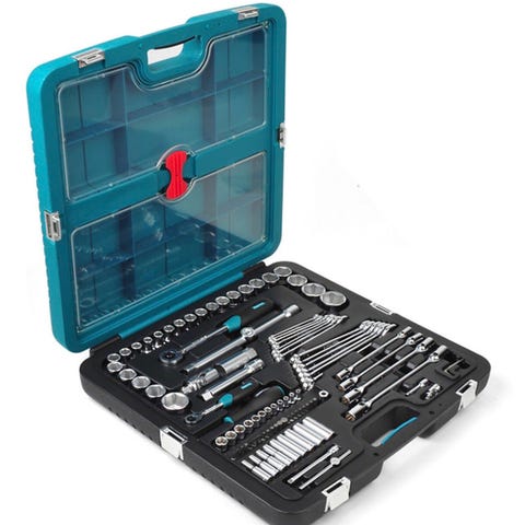 Hela 77 delar, innehåller allt från krafthylsor och vanliga 1/2" hylsor till långa respektive vanliga 1/4" hylsor.