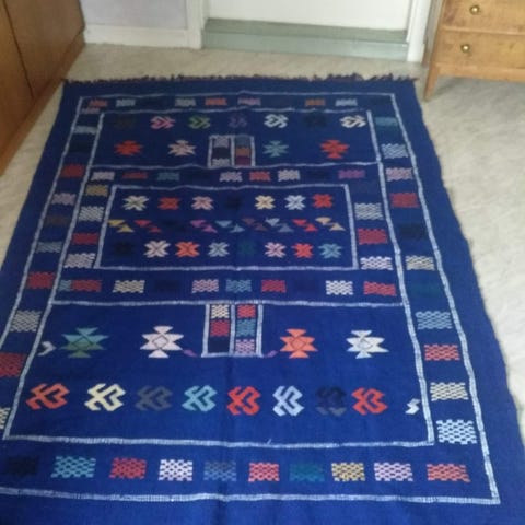 Handknuten marrockansk ullmatta i fint skick. Kan eventuellt behöva en tvätt för att fräscha upp fibrerna, men annars inget att anmärka på.