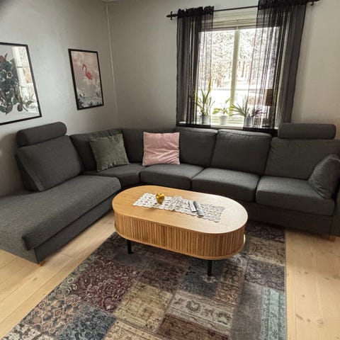 Grå hörnsoffa i tyg med modern och stilren design. Soffan är rymlig och bekväm med plats för flera personer. Använd men i fullt fungerande skick. Säljs i befintligt skick enligt bilder.