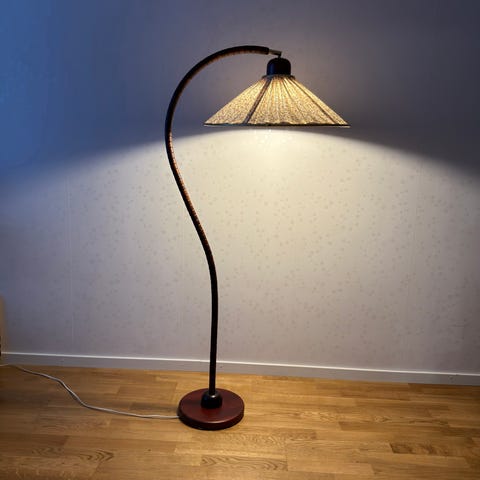 Stilren nätt 50-tals Golvlampa i mässing och svart metall med en plisserad svart lampskärm, höjd 146 cm. Modern kontakt, hel och fin och fungerar. Finns på Kungsgärdet
