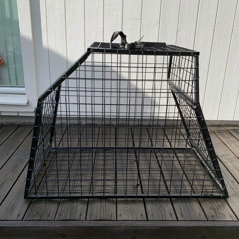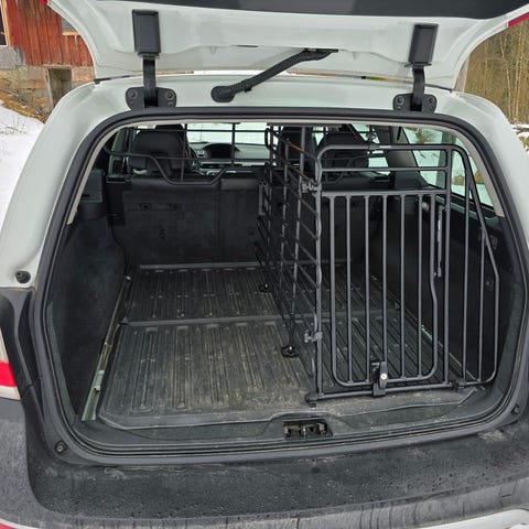 Hundbur för bil med gallerkonstruktion i svart metall. Burens sidor och tak består av rörformade metallstänger och den har en frontöppning med låsbar grind. Konstruktionen är avsedd att placeras i bilens bagageutrymme för att skapa en avgränsad och säker plats för hund under transport. Justerbara fästen upptill och nedtill gör att buren kan spännas fast mot bilens golv och tak.