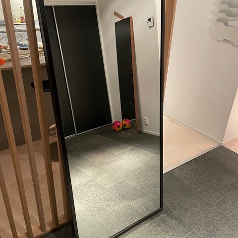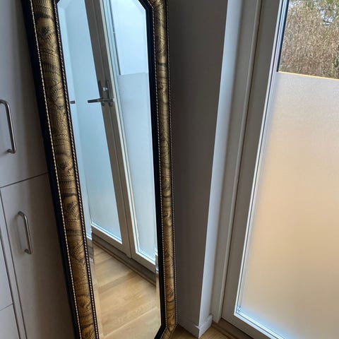Golvspegel i helkroppsmodell med ljus träram och hängare baktill. Spegeln står på ett fristående stativ med stödben, vilket gör den enkel att placera i olika rum. Passar exempelvis i sovrum, hall eller klädkammare för helkroppsvisning vid påklädning.
