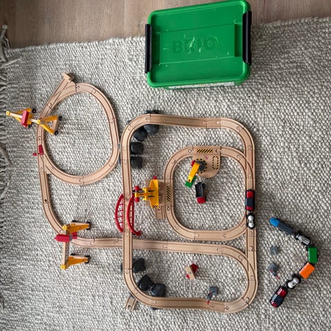 BRIO miniatyrjärnväg trätågset. Setet består av träräls i olika former, bland annat raka och böjda skenor, samt tillbehör som tågdelar. Förvaras i original trälåda med lock. Passar för barn som leker med klassiska trätågbanor och kan kombineras med andra delar ur BRIO:s tågsystem om de är kompatibla i storlek och kopplingar.